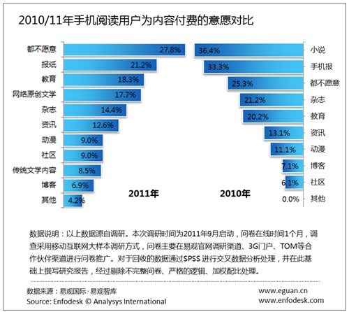 據(jù)易觀國際(Analysys International)《2011年中國手機(jī)閱讀市場用戶研究報告》研究發(fā)現(xiàn),2011年整體手機(jī)閱讀市場付費意愿有所降低。
