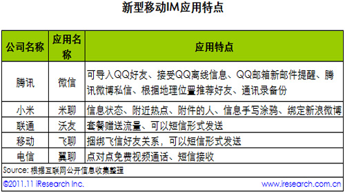 新型移動IM(米聊、微信等)建立在手機通訊錄的基礎(chǔ)上,較以往移動QQ、飛信等具有更強的用戶粘性,并且克服了傳統(tǒng)移動IM需要反復(fù)登錄、只能發(fā)送文字、圖片等缺點。