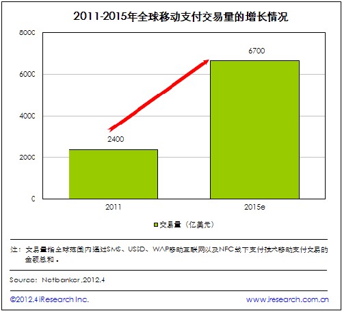 iResearch艾瑞咨詢整理Netbanker的最新數(shù)據(jù)發(fā)現(xiàn),2011年全球移動(dòng)支付交易量達(dá)到2400億美元。該統(tǒng)計(jì)數(shù)據(jù)顯示,2015年全球移動(dòng)支付交易量將達(dá)到6700億美元,使用手機(jī)銀行應(yīng)用程序的用戶數(shù)量較2010年將增加45%左右。另外,預(yù)計(jì)在未來(lái)18個(gè)月內(nèi)還會(huì)有20個(gè)國(guó)家增設(shè)NFC服務(wù)。