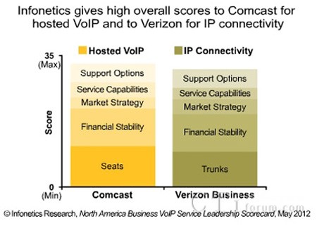 Infonetics Research公司VoIP 和IMS主要分析師Diane Myers 表示:“Comcast公司收購了New Global Telecom,前者在我們企業(yè)VoIP平衡記分卡中常年領先,今年這個收購推動Comcast公司在Infonetics的托管業(yè)務VoIP領導力計分卡中位于第一的位置,連續(xù)四年的排名中,Verizon Business公司在IP 互聯(lián)領導力平衡計分卡中處于第一的位置,其次是AT&T公司”