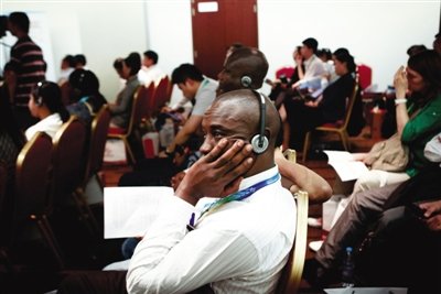 昨日,京交會(huì)上,“中國(guó)分銷服務(wù)業(yè)企業(yè)走出去”會(huì)場(chǎng),一位外籍嘉賓在認(rèn)真聽同聲傳譯。新京報(bào)記者 孫純霞 攝