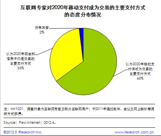 CTI論壇(ctiforum)6月13日消息(記者 楊佳林):據(jù)iResearch艾瑞咨詢整理Pew Internet調(diào)查數(shù)據(jù)發(fā)現(xiàn),多數(shù)互聯(lián)網(wǎng)專家認(rèn)為2020年移動(dòng)支付將取代現(xiàn)金和信用卡成為主流支付方式。其中,65%的受訪專家認(rèn)為到2020年,大多數(shù)消費(fèi)者將采用智能刷卡終端進(jìn)行支付;然而33%的專家不贊成這種推測,他們認(rèn)為到2020年,現(xiàn)金和信用卡將仍然是主要的支付方式,消費(fèi)者對NFC技術(shù)安全性的擔(dān)憂及主要貨幣電子轉(zhuǎn)換技術(shù)的限制會(huì)阻礙移動(dòng)支付的進(jìn)一步發(fā)展。