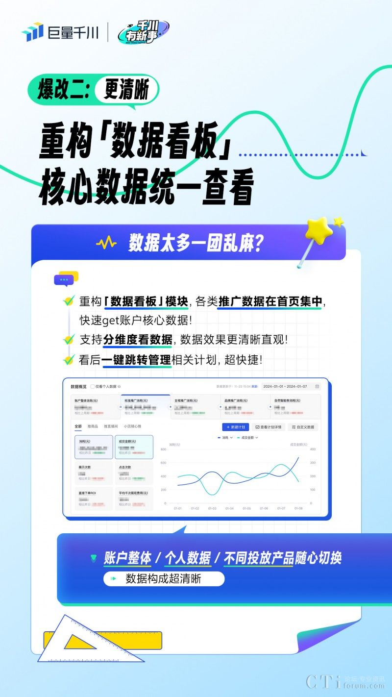 新升級(jí)的巨量千川首頁通過重構(gòu)「數(shù)據(jù)看板」,將重要的推廣數(shù)據(jù)集中在首頁,同時(shí)還支持分維度查看不同數(shù)據(jù)及趨勢變化,讓商家更清晰地看到數(shù)據(jù)背后的投放、經(jīng)營效果。