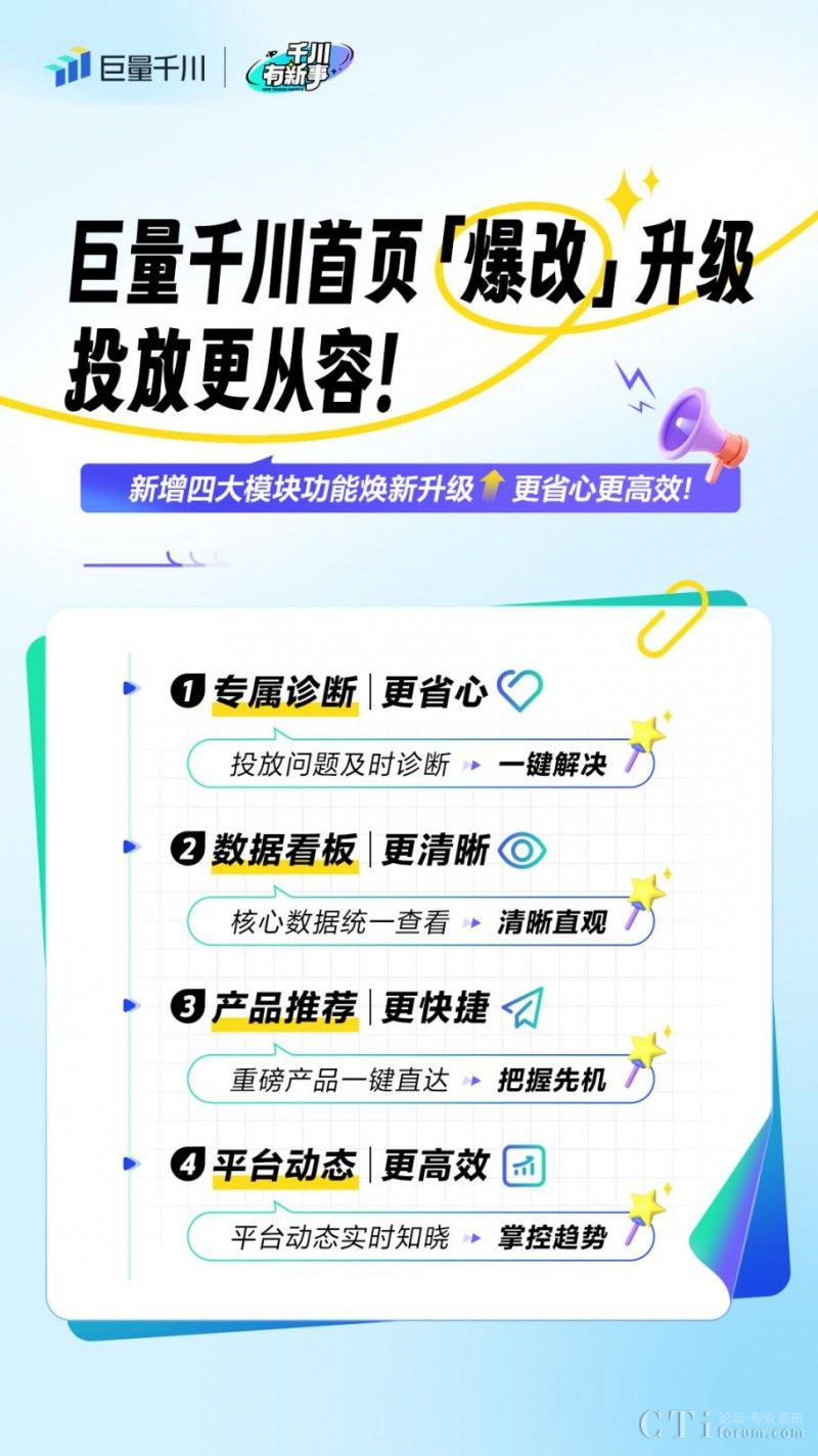 近期,為直面商家投放困境,全面提升投放效率,巨量千川PC端首頁全新推出四大重磅升級(jí)——上線「專屬診斷建議」、「數(shù)據(jù)看板」、「重磅產(chǎn)品推薦」和「平臺(tái)動(dòng)態(tài)」,助力商家更便捷、更從容地提升投放質(zhì)量和效果,高效推動(dòng)生意增長!