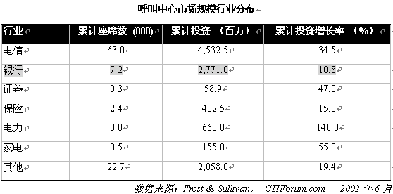 。。中國呼叫中心市場規(guī)模難于確定。根據(jù)CTIForum 的統(tǒng)計數(shù)字,截止到2001年,中國呼叫中心座席總數(shù)達(dá)到96,200個,市場規(guī)模達(dá)到106.38億元,分別較去年同期增長51.6%,55.2%。2001年,中國呼叫中心市場規(guī)模在各行業(yè)中的分布如下表所示: