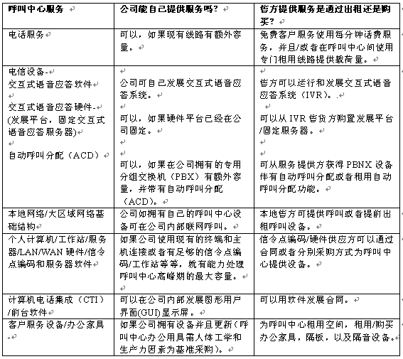 。。一旦決定從事呼叫中心業(yè)務(wù),公司必須確定要從外部售貨方購(gòu)買的服務(wù)與設(shè)備的范圍。公司政策和經(jīng)營(yíng)法則會(huì)指示其應(yīng)遵循什么程序進(jìn)行這一過程。也可能會(huì)是一些合同,它們可以使公司能夠快速地完成這些步驟。