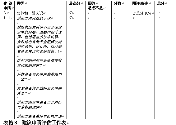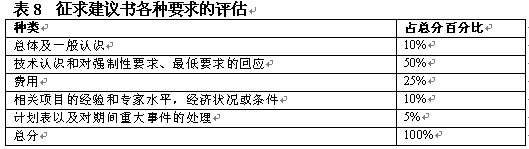 。。在決定了初步要求之后,評(píng)估小組應(yīng)具體地開展評(píng)估工作。具體評(píng)估的目標(biāo)是通過給建議書主要方面打分作出評(píng)估?梢栽谒愠鼋ㄗh書各方面占總分?jǐn)?shù)的百分比,如表8中對(duì)各方面的總覽。一般在建議書內(nèi)向提供者給出這一信息。