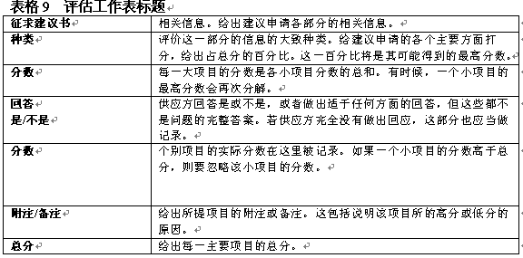 建議申請(qǐng)?jiān)u估工作表有助于資源選擇工作組客觀地對(duì)承包商建議進(jìn)行評(píng)價(jià)。這一過程包括在總分基礎(chǔ)上給各個(gè)方面評(píng)分。表格8舉出了一個(gè)具體的評(píng)分表表格9包含了對(duì)工作表標(biāo)題的解說。