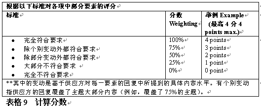 。。評(píng)分者應(yīng)該了解供應(yīng)方對(duì)所提建議申請(qǐng)的回復(fù),從各方面評(píng)估該建議符合每一評(píng)判標(biāo)準(zhǔn)的情況,相應(yīng)地給出分?jǐn)?shù)。根據(jù)每個(gè)標(biāo)準(zhǔn),應(yīng)在評(píng)判過程中分組給出最高分?jǐn)?shù)。表格9舉例說明了如何對(duì)回復(fù)打分。.