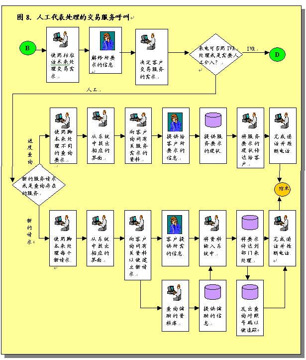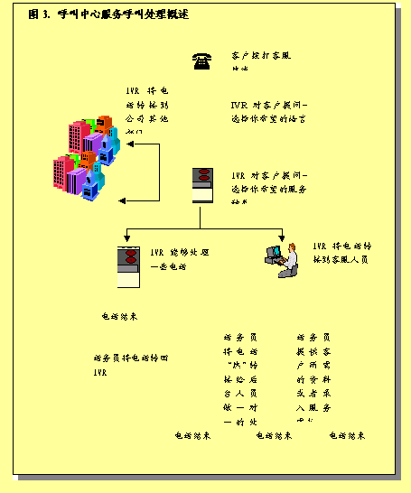 圖3概述了呼叫中心服務(wù)呼叫處理過程。描述了進入呼叫中心系統(tǒng)的各種呼叫如何完成處理過程,或者由真人代表完成,或者是通過IVR技術(shù)完成。