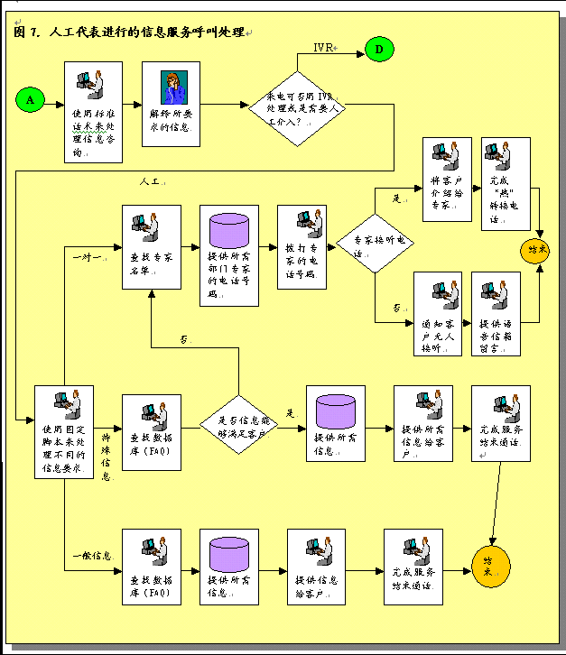 各部門也需要修改步驟處理和完成服務(wù)請求。現(xiàn)在,大多數(shù)公司個別部門接受和完成服務(wù)請求。許多部門在完成工作之后沒有對結(jié)果進行跟蹤回訪。對于一些部門服務(wù)請求只是紙上談兵。為了有效的提供呼叫中心服務(wù)并為服務(wù)請求提供信息,各部門必須采用新的步驟。這些步驟應(yīng)包括從服務(wù)請求系統(tǒng)中重新獲取呼叫請求信息,跟蹤這些請求,工作完成后更新服務(wù)請求系統(tǒng)。對于沒有信息系統(tǒng)和目前使用人工操作的部門,要達到這一工作要求就需要設(shè)計和實施新的程序和系統(tǒng)。
