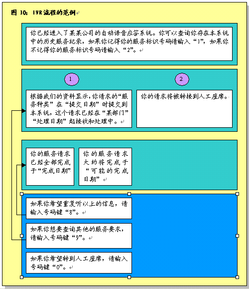 根據(jù)呼叫處理部分所作的說明,在完成初次聯(lián)絡(luò)過程之后,服務(wù)代表將確定呼叫者的需要。之后服務(wù)代表將協(xié)助呼叫者或者使其選擇IVR系統(tǒng),該系統(tǒng)通過自動為這些請求錄音提供相關(guān)的信息和服務(wù)。服務(wù)代表將接受培訓(xùn)識別哪些交易服務(wù)和信息服務(wù)可以通過IVR進行,這樣他們可以使呼叫者選擇自我服務(wù)。圖9圖示了用這一辦法處理呼叫的過程。