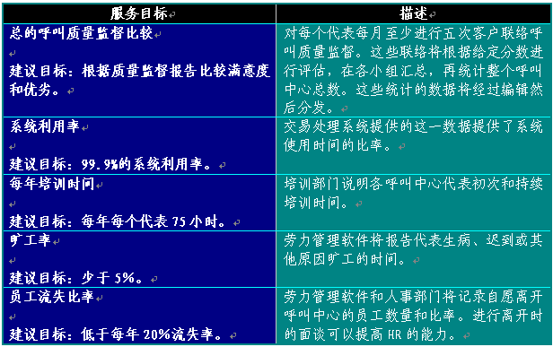 表格3中列出了一些日常工作評估標(biāo)準(zhǔn)。同時也提供了可以利用的最佳實(shí)踐目標(biāo)。隨著時間的持續(xù),呼叫中心也可以設(shè)定額外目標(biāo)評估運(yùn)營工作。