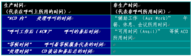 如果工作狀態(tài)最佳,代表的工作目標為80%的時間用在呼叫上,其余為非生產(chǎn)時間。主管運用ACD報告結合第一手調查資料考察這些工作所用的時間。