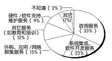 根據(jù)IT支出就可以推測購買過程及其重點。平均而言,在被調(diào)查者的CRM支出中,29%用在硬件上,16%用在軟件上,38%用在內(nèi)部服務上,16%用在外部服務上。圖2顯示了用在外部服務上的IT支出,其中包括: