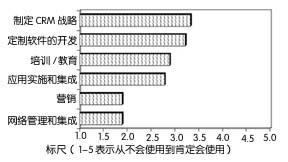 通常,通信提供商相對而言不愿意求助于專業(yè)服務公司來幫助其實施CRM解決方案。在1~5的標尺中,只有積分為5的公司可能使用專業(yè)服務公司,分數(shù)低于3.5的公司沒有一家會這么做,這表明通信提供商仍由內(nèi)部人員來實施多數(shù)功能。調(diào)查的分數(shù)表明他們最可能與外部服務提供商合作制定戰(zhàn)略——定制軟件開發(fā)(3.33)和培訓(3.22)。他們最不可能求助此類公司來從事網(wǎng)絡管理和集成(1.89)或營銷(1.89)工作。圖3顯示的就是這些調(diào)查結果。