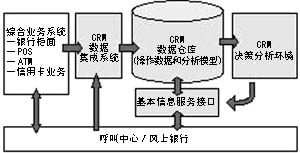 在CRM數(shù)據(jù)倉庫中,實際數(shù)據(jù)分為操作數(shù)據(jù)和分析模型。操作數(shù)據(jù)包括客戶基本信息、客戶賬務(wù)信息和操作控制(客戶個性化服務(wù)信息)。分析模型包括客戶關(guān)系管理的所有分析模型、市場分析、客戶信用度分析、客戶滿意度分析和銷售行為分析。因此,CRM的主體部分將通過數(shù)據(jù)集成系統(tǒng)與業(yè)務(wù)處理部分(綜合柜面系統(tǒng)等)和客戶聯(lián)系部分(呼叫中心等)連接起來。同時,由于業(yè)務(wù)處理部分一般都采用銀行的現(xiàn)有系統(tǒng),而呼叫中心則可以成為一個相對獨立的模塊,因此,銀行CRM系統(tǒng)的實施主要體現(xiàn)在CRM數(shù)據(jù)集成系統(tǒng)、CRM數(shù)據(jù)倉庫、CRM決策分析環(huán)境、基本信息服務(wù)接口等四大部分。