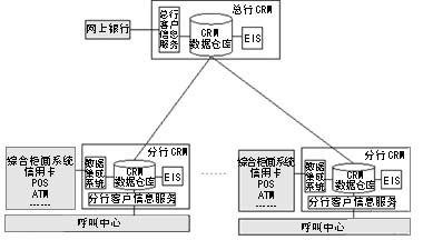 由于銀行在各地建有大量的分支機構(gòu),銀行CRM系統(tǒng)一般都采用分布式數(shù)據(jù)倉庫環(huán)境,即所有分行均擁有自己的CRM系統(tǒng),并與本地綜合業(yè)務(wù)系統(tǒng)及呼叫中心連接。在總行建有中心CRM數(shù)據(jù)倉庫,提供面向全行的分析決策功能,并為網(wǎng)上銀行業(yè)務(wù)提供數(shù)據(jù)查詢支持。
