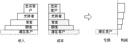 科特勒根據(jù)客戶的忠誠度給了我們一個階梯,這是客戶關系管理工作的良好參照,同時也可作為客戶關系管理工作考核的工具。我們將這個階梯做如下改造:每個層次的寬度是此級次客戶的數(shù)量,每個層次的高度是此級次客戶給企業(yè)帶來的收入,我們可以得到一個企業(yè)收入客戶分布結構圖,如右圖所示: 從圖中可以很清楚的看出客戶管理工作的內容:層次寬度(每個層次客戶的數(shù)量)和層次的高度(每個層次客戶的平均贏利水平)。 |