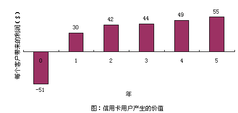 以信用卡服務(wù)為例,爭(zhēng)取一個(gè)新的用戶平均要51美圓,用于廣告、推銷和開戶等開支。用戶開始時(shí)花錢很少,但為公司帶來(lái)一定的利潤(rùn)。但如果用戶繼續(xù)使用到第二年,就會(huì)為公司帶來(lái)更多的經(jīng)濟(jì)效益,因?yàn)楣九c客戶之間的信任和客戶對(duì)公司的滿意,致使客戶更多地通過信用卡消費(fèi)。(圖:"信用卡用戶產(chǎn)生的價(jià)值")用戶貢獻(xiàn)在增加,公司的運(yùn)作費(fèi)用卻在不斷減低。信用卡公司可以不斷減少對(duì)客戶信用的審核時(shí)間。保持長(zhǎng)期的客戶關(guān)系,還可以減少?gòu)V告支出,客戶本身就是一個(gè)免費(fèi)的廣告資源。很多人在消費(fèi)前喜歡聽取朋友的意見,覺得比廣告更可信。