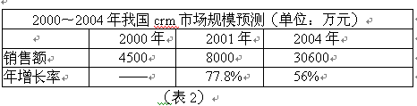 國(guó)內(nèi)CRM市場(chǎng)經(jīng)過(guò)一段時(shí)間的快速增長(zhǎng),2000年銷售額達(dá)到4500萬(wàn)元左右。2001年市場(chǎng)情況將更好,預(yù)計(jì)銷售額將是上年的兩倍左右。CCID根據(jù)大量調(diào)查分析,對(duì)我國(guó)CRM市場(chǎng)規(guī)模作出如下預(yù)測(cè):