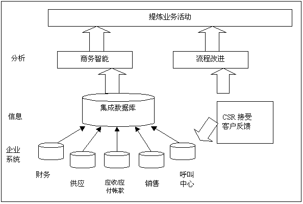 分析型CRM,也著稱為“后臺(tái)”或“戰(zhàn)術(shù)”CRM。用來分析理解發(fā)生在前臺(tái)的客戶活動(dòng)。分析型CRM需要技術(shù)(編譯和處理大量的客戶數(shù)據(jù),以便于分析)和新的業(yè)務(wù)流程(提煉面向客戶的業(yè)務(wù),以提高忠誠(chéng)度和利潤(rùn)率)。在分析師和業(yè)界專家的推動(dòng)下,如今大多數(shù)CRM供應(yīng)商,或者創(chuàng)造分析型CRM能力,或者與商務(wù)智能(BI)供應(yīng)商合伙,合作分析他們的數(shù)據(jù)。圖2表明了數(shù)據(jù)和流程如何用來提煉業(yè)務(wù)活動(dòng)。