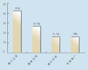 關(guān)于所應(yīng)用的CRM類(lèi)型,有5家是呼叫中心,5家是分析型,7家是運(yùn)營(yíng)型,2家是屬于大型企業(yè)CRM。其中13家擁有動(dòng)態(tài)客戶(hù)數(shù)據(jù)庫(kù),占到68.4%。這其中又有42%利用數(shù)據(jù)庫(kù)作客戶(hù)記錄,26.3%作為客戶(hù)支持使用,15.7%用作統(tǒng)計(jì)分析,另有16%作為市場(chǎng)推廣。保險(xiǎn)公司與客戶(hù)聯(lián)系的方式,從重要性來(lái)看依次為:面對(duì)面\電話\網(wǎng)絡(luò)\傳真,這說(shuō)明保險(xiǎn)公司對(duì)于與客戶(hù)進(jìn)行人性化交流的重視。在問(wèn)到CRM的主要作用時(shí),有5家表示使用CRM有助于保險(xiǎn)業(yè)了解自身的經(jīng)營(yíng)情況,幫助公司準(zhǔn)確地發(fā)現(xiàn)贏利客戶(hù)和具有贏利潛力的客戶(hù),有7家認(rèn)為使用CRM有助于分析客戶(hù)的消費(fèi)傾向,有7家認(rèn)為使用CRM有助于優(yōu)化信息和資源管理。在問(wèn)到是否愿意為像CRM系統(tǒng)這樣的咨詢(xún)或服務(wù)付費(fèi)時(shí),有11家表示愿意,占到57.8%。