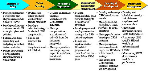 從工作的組織方法到人員雇用,再到一個角色如何影響客戶的工作描述、根據(jù)對公司確立CRM的貢獻如何進行獎勵、雇員發(fā)展、管理勞動力信息等等,統(tǒng)統(tǒng)都是成功CRM的一部分。
