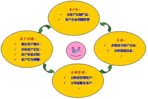流程涉及到客戶生命周期管理、知識管理的流程。具體來說,流程涉及到兩大方面,其一,CRM成功實(shí)施后的企業(yè),應(yīng)該在業(yè)務(wù)流程上一個(gè)變革。企業(yè)各個(gè)部門開展業(yè)務(wù)的共同前提是:以客戶為中心。其二,企業(yè)應(yīng)當(dāng)通過CRM來建立一種客戶管理的優(yōu)化流程,從客戶識別,到分級管理,再到企業(yè)與客戶互動,再到為客戶定制產(chǎn)品;然后循環(huán)往復(fù)。具體我們可以參見下圖: