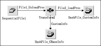 客戶(hù)信息數(shù)據(jù)庫(kù)中的各表以客戶(hù)編碼為關(guān)鍵字進(jìn)行關(guān)聯(lián),客戶(hù)編碼是由客戶(hù)的證件號(hào)碼經(jīng)過(guò)專(zhuān)門(mén)的算法計(jì)算產(chǎn)生的唯一客戶(hù)標(biāo)識(shí)。根據(jù)各個(gè)系統(tǒng)中客戶(hù)數(shù)據(jù)與新系統(tǒng)客戶(hù)信息的對(duì)照關(guān)系我們?cè)O(shè)計(jì)數(shù)據(jù)抽取轉(zhuǎn)換的程序,如圖4所示是一個(gè)DataStage的Job。