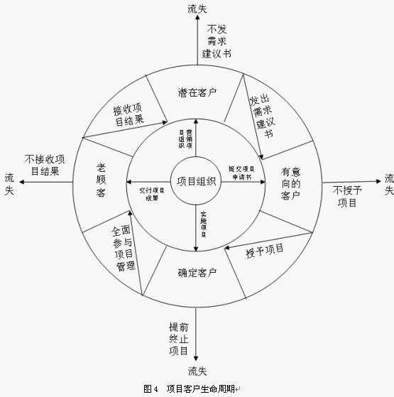 需要特別注意的一點(diǎn)是,在項(xiàng)目的整個(gè)生命周期中,如果客戶不滿意項(xiàng)目組織提供的服務(wù),將會離開項(xiàng)目組織,造成客戶流失。
