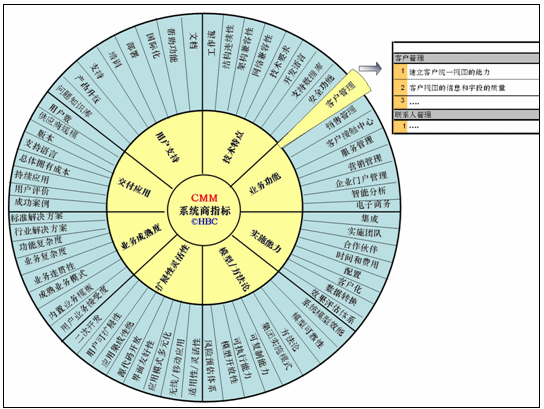 CMM體系中的標(biāo)準(zhǔn)并非在每一次評(píng)估中都需要用的,它實(shí)際上是一個(gè)滿足大部分CRM評(píng)估的標(biāo)準(zhǔn)的合集。所以應(yīng)用者首先要自己或者借助評(píng)估顧問來選擇CMM指標(biāo)范圍,確定哪些指標(biāo)參與此次評(píng)估。