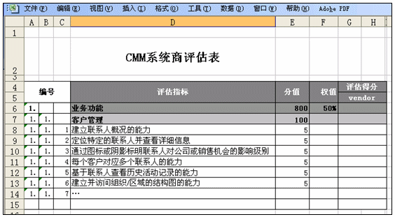 根據(jù)評(píng)估分?jǐn)?shù)值形成CMM評(píng)估表,為電子表格形式,帶有指標(biāo)編號(hào)和權(quán)重、分值,后面為實(shí)際評(píng)測分?jǐn)?shù)和備注,可以作為單獨(dú)的廠商系統(tǒng)評(píng)測,也可以作為橫向的多家廠商系統(tǒng)的水平評(píng)測。當(dāng)橫向的多家系統(tǒng)商評(píng)測時(shí)實(shí)際評(píng)測分?jǐn)?shù)欄為多家系統(tǒng)商評(píng)測分?jǐn)?shù)。