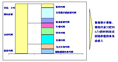 銷售資源是有限的,如何合理分配資源并確保最大的客戶機會和客戶價值是一個關(guān)鍵的問題。對于銷售代表,個人的時間是寶貴的資源。根據(jù)統(tǒng)計數(shù)據(jù),銷售人員只把約1/3的時間用于增值的業(yè)務(wù)洽談上,這意味著在銷售人員的時間管理上有很大的提升空間。如圖3-1所示。