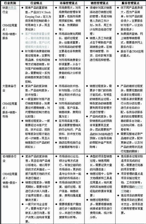 從以上簡單的分析過程我們可以看出由于企業(yè)所處行業(yè)特點的不同,導致在市場、銷售和服務方面對CRM主要功能需求差別非常大。企業(yè)在實際選型過程中,還需要對行業(yè)再進行細分分析,比如在快速消費品中,洗滌用品行業(yè)和牛奶乳業(yè)行業(yè)在客戶服務的主要需求等方面就有比較大的差別,這些都需要細致的分析。
