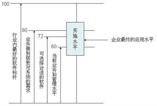 如果用一個數(shù)量化的概念來表達的話,假定行業(yè)內最好的軟件是100分,企業(yè)做到極致對系統(tǒng)的需求可能是80分,當然也可能沒有一個軟件能滿足企業(yè)所有的需求,但從整體上,一個企業(yè)的主體需求一定在行業(yè)內最好的軟件標桿之下。而當前的業(yè)務和管理水平一般到不了極致,假設是60分,那選擇的軟件70-75分一定是合適的,高于當前需求,而不要高得太多,最終的實施水平是一個區(qū)間,這取決于實施商的能力和企業(yè)的能力,可能會低于企業(yè)當前業(yè)務和管理水平,也可能使系統(tǒng)超水平發(fā)揮,而企業(yè)最終的應用水平一般就在這個區(qū)間里游動了。這個模型看起來很理論化,操作時需要考慮很多的因素,但是非常有價值的判斷標準。