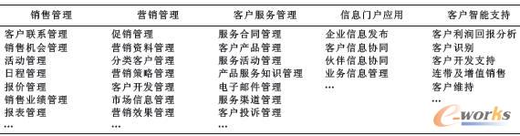 CRM應(yīng)用系統(tǒng)功能平臺對應(yīng)于平臺架構(gòu)中的應(yīng)用功能層,是系統(tǒng)平臺的卞體部分。基于對A企業(yè)的需求分析及B/S的平臺架構(gòu)特點,筆者將系統(tǒng)功能綜合歸納為銷信管理、營銷管理、客戶服務(wù)管理、信息門戶應(yīng)用及客戶智能支持5大模塊,它們共同構(gòu)成的系統(tǒng)的功能平臺如圖2所示,詳細功能設(shè)計如表1所示。