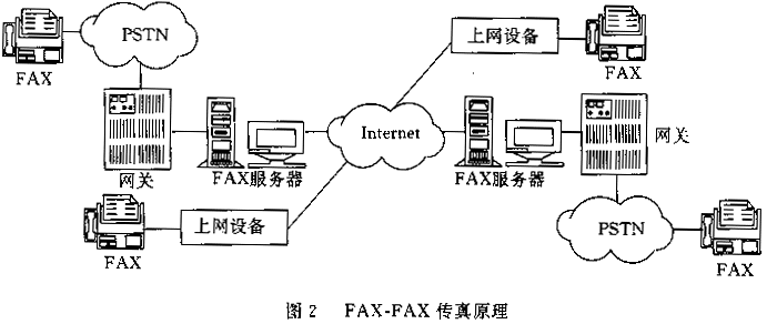 發(fā)送端傳真機與網(wǎng)關連接,通過PSTN傳送傳真,網(wǎng)關接收傳真后通過Internet傳至另一端的網(wǎng)關,另一端的網(wǎng)關再通過PSTN將傳真發(fā)送給接收端傳真機。這種方式既適合存儲轉發(fā)模式,也適合實時模式,因此更加有吸引力。近年來,出現(xiàn)了一種不依賴網(wǎng)關的FAX-FAX IP傳真技術,它是利用傳真機外掛一專用上網(wǎng)設備直接在Internet網(wǎng)上發(fā)送信息,原理如圖2所示。