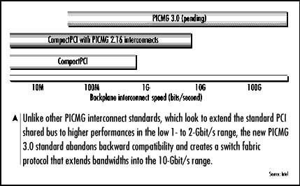 PICMG是CompactPCI的升級標(biāo)準(zhǔn),但是與CompactPCI有很大的不同,CompactPCI是共享式總線結(jié)構(gòu),而PICMG提供了交換式連接,每個點(diǎn)到點(diǎn)的連接能達(dá)到10Gbps的帶寬。圖1所示為幾種技術(shù)的互聯(lián)帶寬比較。PICMG標(biāo)準(zhǔn)的提出主要是針對電信行業(yè)方面的應(yīng)用,因此在供電方面采用了電信界的雙-48V電源標(biāo)準(zhǔn),而非CompactPCI的ATX電源標(biāo)準(zhǔn)。因此,PICMG標(biāo)準(zhǔn)與CompactPCI在很大程度上不兼容。