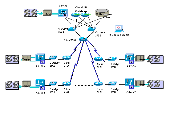各地:采用CISCO2620路由器和AS5300語音網(wǎng)關(guān)。Cisco2620配2個串口和1個100M以太網(wǎng)口,串口用來連接DDN網(wǎng)絡(luò),100M口連到石油專用通信網(wǎng)局內(nèi)部數(shù)據(jù)網(wǎng)絡(luò),并與CISCO AS5300相連。AS5300有1個100M以太網(wǎng)口,1個10以太網(wǎng)口,4個E1口,60個VOIPDSP。4個E1口連接交換機(jī)。