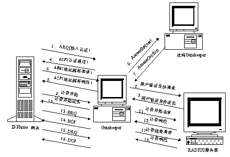2、用戶認(rèn)證:網(wǎng)關(guān)用ARQ把用戶卡號(hào)和密碼發(fā)給網(wǎng)守,網(wǎng)守再把卡號(hào)和密碼送給計(jì)費(fèi)認(rèn)證中心,如果計(jì)費(fèi)認(rèn)證中心認(rèn)證通過,網(wǎng)守向網(wǎng)關(guān)發(fā)ACF,否則回ARJ。