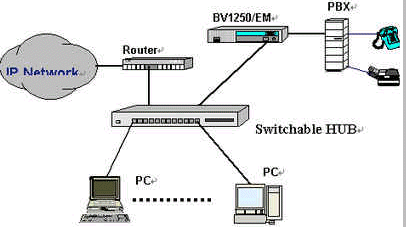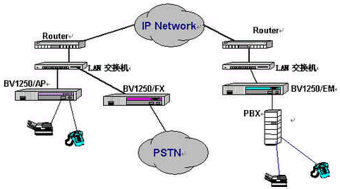 OKI公司的IVG BV1250互聯(lián)網(wǎng)絡(luò)IP電話語音網(wǎng)關(guān)就是一種非常好的選擇,完全基于H.323 Ver2.0協(xié)議,實(shí)現(xiàn)語音和傳真在因特網(wǎng)上傳輸。使用BV1250 進(jìn)行IP電話和IP FAX通信時(shí),可以感覺到與傳統(tǒng)的電話或傳真所提供的服務(wù)毫無區(qū)別。運(yùn)用BV1250,可通過互聯(lián)網(wǎng)(Internet/Intranet)將電話機(jī)、傳真機(jī)和PBX進(jìn)行互連,建立專用的IP電話網(wǎng)絡(luò)。BV1250使用的是靜態(tài)IP地址,因此不能將BV1250連接到使用DHCP(動(dòng)態(tài)主機(jī)通信規(guī)程)的互聯(lián)網(wǎng)上。常用連接方式如下圖所示:
