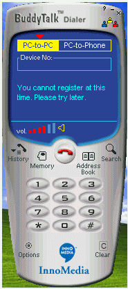 。ㄈ鐖D3),這個就是BuddyTalk的軟件界面。這象不象一個手機(jī)?上面的藍(lán)色部分是液晶屏。你可以選擇pc-to-pc或者pc-to-phone,下面是用來輸入電話號碼的一個空框,空框下面的部分是軟件顯示提示信息的,再下面是音量大小的顯示器。液晶屏的下面部分跟手機(jī)幾乎一樣,其中一個“search”,這是用來上網(wǎng)實(shí)現(xiàn)全球用戶數(shù)據(jù)庫搜索,一個“options”,各種設(shè)置可以在這里完成,“Memory”記錄的是你通話信息,以利快速撥號。