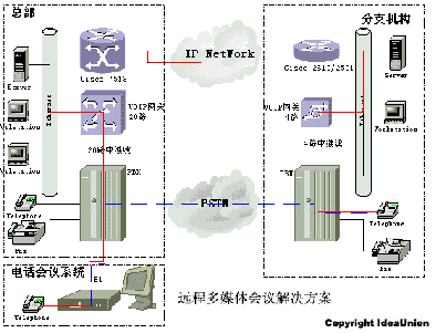 圖中紅色實(shí)線表示通過(guò)IP網(wǎng)絡(luò)傳輸語(yǔ)音的線路,藍(lán)色虛線表示通過(guò)PSTN傳輸語(yǔ)音的線路。由于通過(guò)IP網(wǎng)絡(luò)沒(méi)有使用額外的長(zhǎng)途線路,所以降低了遠(yuǎn)程會(huì)議系統(tǒng)的運(yùn)行成本。同時(shí)VoIP傳輸系統(tǒng)支持普通的長(zhǎng)途電話呼叫,為客戶(hù)節(jié)省長(zhǎng)途電話開(kāi)支。