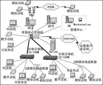 首信的IP-PBX解決方案如圖所示。以某局為例,市局與各分局之間已有寬帶網(wǎng),充分利用此帶寬以數(shù)字電話形式開展語音業(yè)務。數(shù)字電話的實現(xiàn)形式有:PC話機、數(shù)字話機、可視電話、通過模擬線適配器接入的模擬話機,數(shù)字電話設備直接通過Hub與以太網(wǎng)交換機相連。數(shù)字電話通過IP電話網(wǎng)關(guān)與市局中心的程控交換機PBX相連,從而與現(xiàn)有的模擬話機相通。各種數(shù)字話機與內(nèi)部模擬話機間通話,都不需要付電話費,通過PBX撥打局外面的市話或長途電話時,與原來的模擬電話一樣付費。