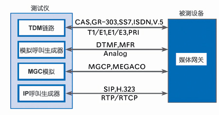 我們按照VoIP組網(wǎng)的原理,構(gòu)建了這樣一個(gè)基本網(wǎng)絡(luò),其網(wǎng)絡(luò)結(jié)構(gòu)如圖4所示。我們用軟交換的概念來(lái)描述網(wǎng)絡(luò)上的設(shè)備,在這個(gè)網(wǎng)絡(luò)上,MG(媒體網(wǎng)關(guān))和MGC(媒體網(wǎng)關(guān)控制器)是關(guān)鍵的VoIP網(wǎng)絡(luò)元素。這些網(wǎng)絡(luò)元素可以是支持H.323、MGCP、H.248或者SIP的實(shí)體。本文中提到的MG和MGC不具體指某一個(gè)設(shè)備,本次測(cè)試正是針對(duì)這兩類設(shè)備進(jìn)行,測(cè)試的主要內(nèi)容也圍繞著這兩類設(shè)備展開。測(cè)試從模擬話音開始,然后延伸到PSTN網(wǎng)絡(luò),再到IP網(wǎng)絡(luò),最后回到模擬話機(jī)的被叫方。在這樣一個(gè)完整通話過(guò)程中,測(cè)試MG以及MGC的信令互操作性以及設(shè)備處理信令的能力。圖5是測(cè)試系統(tǒng)結(jié)構(gòu)原理圖。
