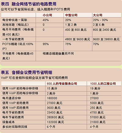 據(jù)研究顯示,當(dāng)公司融合它們的網(wǎng)絡(luò)后,將電信費(fèi)用減少了25%到60%。(見表四)這筆費(fèi)用包括每分鐘長(zhǎng)途、本地環(huán)路、普通電話服務(wù)(POTS)線路和音頻/視頻服務(wù)。