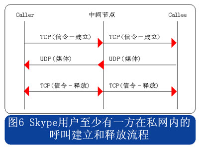 從上述流程圖可見,Skype的呼叫信令都采用TCP封裝,而媒體流則使用UDP封裝,當(dāng)有任何一方用戶位于限制UDP包的防火墻內(nèi)時,媒體流就會采用TCP封裝。另外當(dāng)Skype用戶至少有一方位于私網(wǎng)內(nèi)時,所有的信令和媒體消息都經(jīng)過一個或多個中間節(jié)點轉(zhuǎn)發(fā)。此時無需擔(dān)心用戶通話的媒體流因為經(jīng)過中間節(jié)點轉(zhuǎn)發(fā)而被竊聽,因為Skype采用了對消息進(jìn)行端到端加密的機(jī)制。