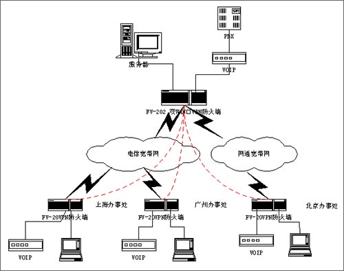 VPN防火墻網(wǎng)關(guān)具有雙WAN口和QOS帶寬管理功能,總部同時(shí)接入兩條ADSL線路,通過策略路由,把內(nèi)部網(wǎng)絡(luò)的上網(wǎng)訪問全部從WAN2的ADSL上網(wǎng),而把VOIP和VPN全部通過WAN1的ADSL來傳輸,從而避免了上網(wǎng)的請(qǐng)求占用VPN和VOIP的帶寬。同時(shí),通過對(duì)內(nèi)部網(wǎng)絡(luò)不同的業(yè)務(wù)劃分不同的優(yōu)先級(jí),特別是把VOIP的優(yōu)先級(jí)做為最高,優(yōu)先轉(zhuǎn)發(fā)VOIP的數(shù)據(jù)包,同時(shí)又通過VOIP和VPN傳輸分配最大和最小的保證帶寬,來保護(hù)VOIP業(yè)務(wù)的正常通信。除此之外,F(xiàn)V-202強(qiáng)大的訪問控制功能,特別是對(duì)VPN隧道的訪問控制功能,可以對(duì)各地的分公司通過VPN訪問總公司的服務(wù)器進(jìn)行控制,為不同的客戶分配不同的權(quán)限,讓遠(yuǎn)程的VPN隧道只能訪問指定的IP地址或相關(guān)的業(yè)務(wù)端口,能很好保證VPN的訪問安全。特別值得一提的是,F(xiàn)V-202支持網(wǎng)通、電信雙線路接入,如果由于北方網(wǎng)通跨網(wǎng)接入,可以在全部申請(qǐng)網(wǎng)通線路,把北方的分支機(jī)構(gòu)接入到總部的網(wǎng)通線路,可以避免由于跨網(wǎng)帶來的帶寬瓶頸。在各個(gè)分支機(jī)構(gòu)配置iRouter的FV-20VPN防火墻,為各個(gè)分支機(jī)構(gòu)構(gòu)建一道安全的防線,實(shí)現(xiàn)與總部的VPN的聯(lián)接。同時(shí),外出的員工或領(lǐng)導(dǎo)通過IPSEC的撥號(hào)軟件,實(shí)現(xiàn)移動(dòng)的接入,通過VPN,東莞奧愛斯構(gòu)建全國(guó)的融合的安全通信平臺(tái),既可以解決VOIP的被竊聽的風(fēng)險(xiǎn),又能實(shí)現(xiàn)實(shí)時(shí)的數(shù)據(jù)訪問。從而大大地降低公司長(zhǎng)途的話費(fèi)和以往租用數(shù)據(jù)專線的高昂的費(fèi)用,提高了公司的工作效率,為公司帶來十分明顯的經(jīng)濟(jì)效益。