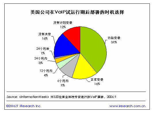 iResearch艾瑞市場(chǎng)咨詢整理《InformationWeek》對(duì)320位商業(yè)科技專家進(jìn)行的VoIP調(diào)研數(shù)據(jù)顯示,美國(guó)有近四成的公司在VoIP試運(yùn)行期后安裝了VoIP,正在安裝的也達(dá)到了一成以上,打算在6個(gè)月以內(nèi)安裝的有近一成。